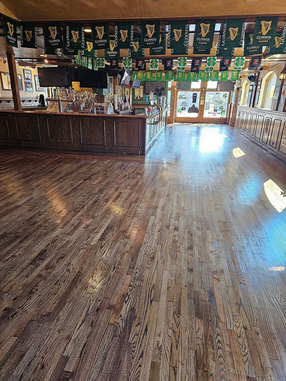 A collection of images showcasing modern interior design with elegant staircases, spacious rooms, and wooden flooring. The images also feature interior spaces under renovation and local businesses with wooden floors and banners.